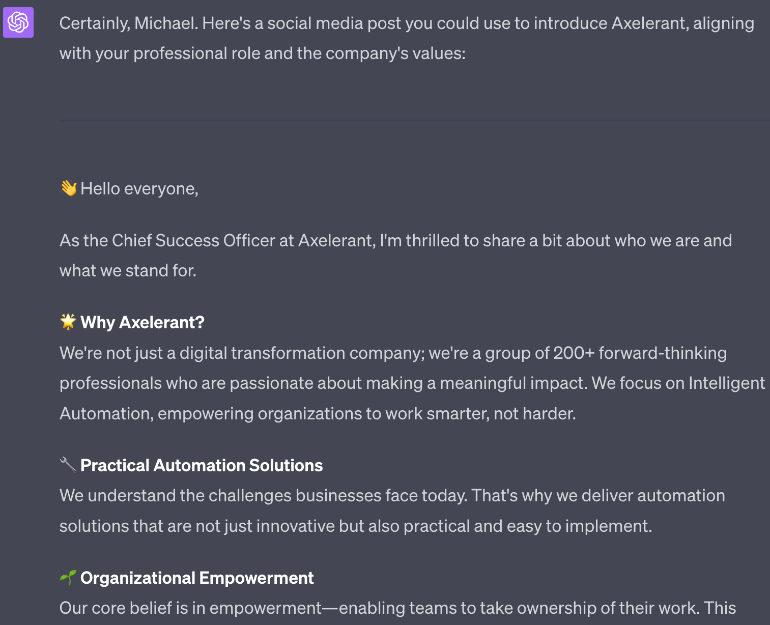For example, asking As me, write a social media post introducing Axelerant without Custom Instructions leads to a very impersonal response.