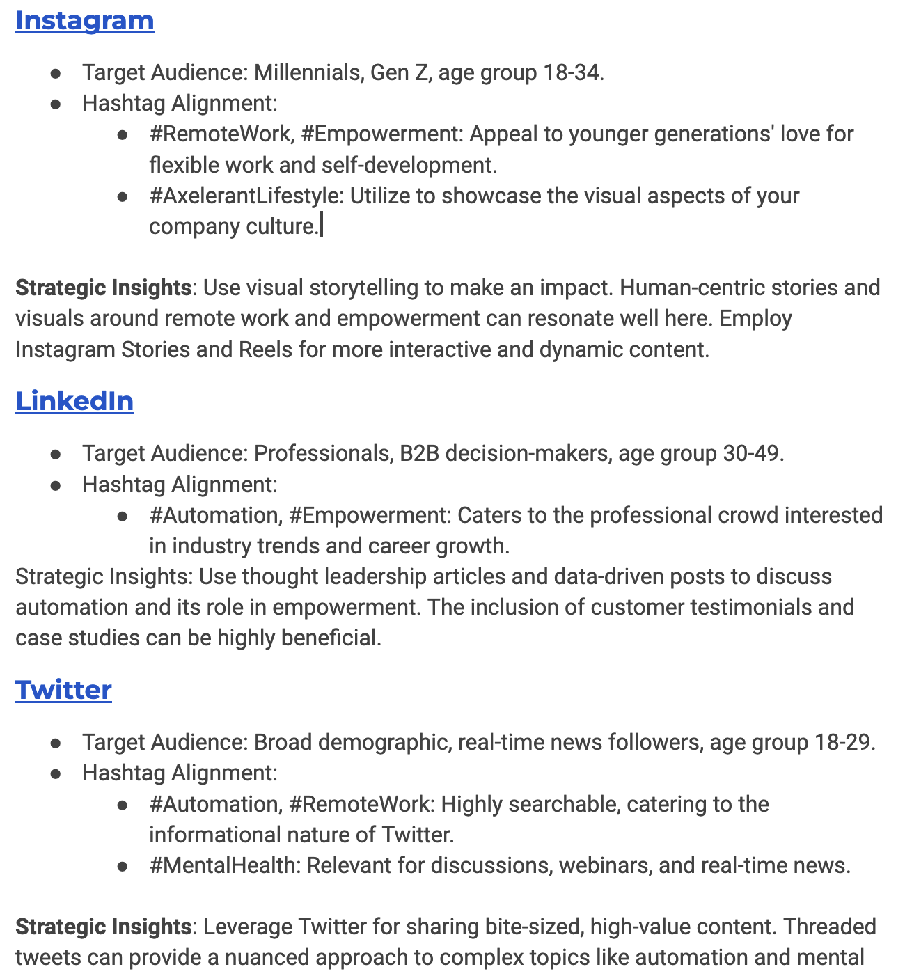 How does content based on the hashtags "#Automation, #AxelerantLifestyle, #Empowerment, #MentalHealth, and #RemoteWork" align best with the audiences of these social media networks "Facebook Page, Instagram, LinkedIn, Twitter, and YouTube"?