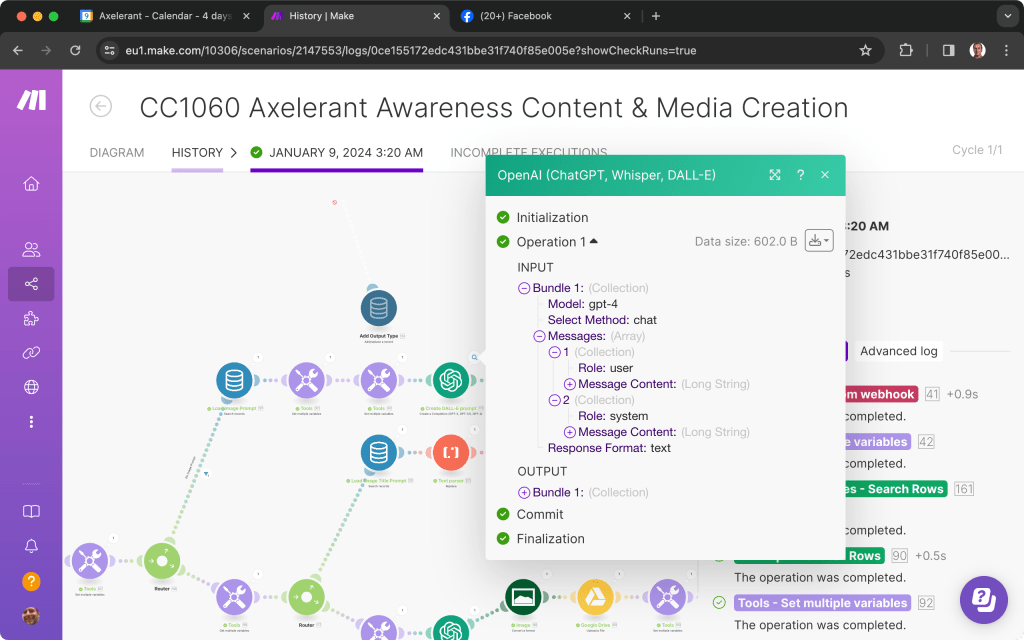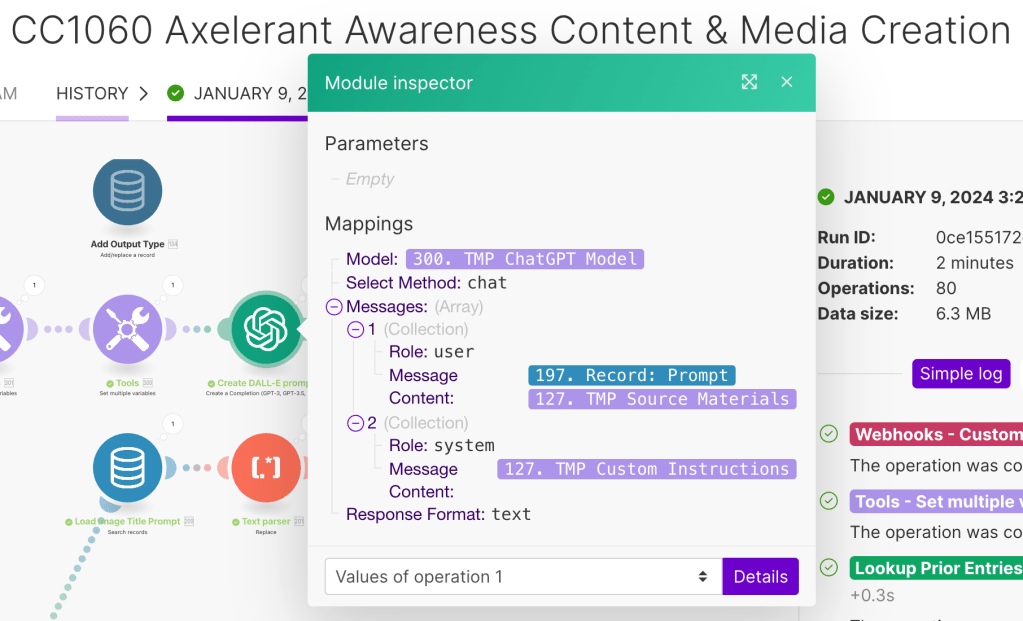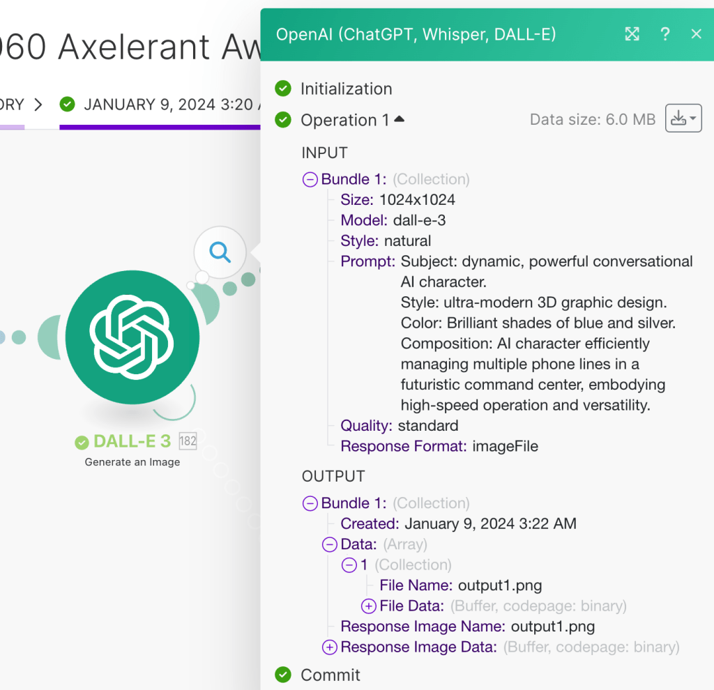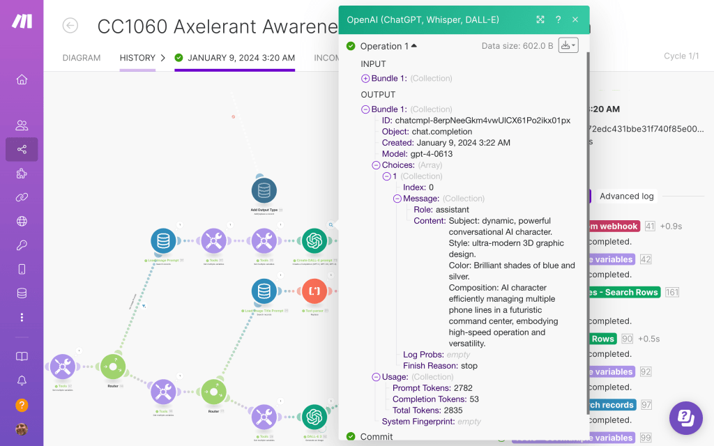That image prompt is fed to a Make.com OpenAI DALL-E 3 image creation module.