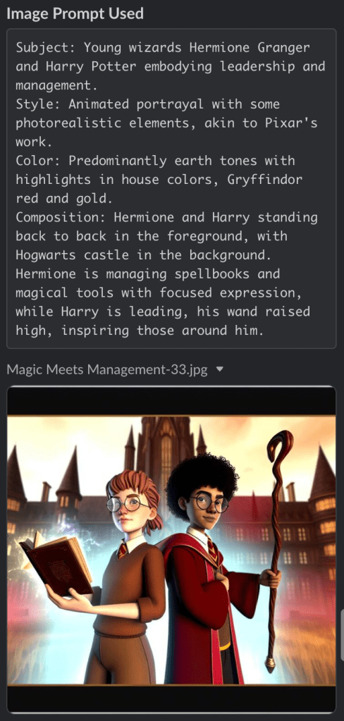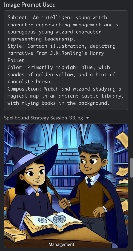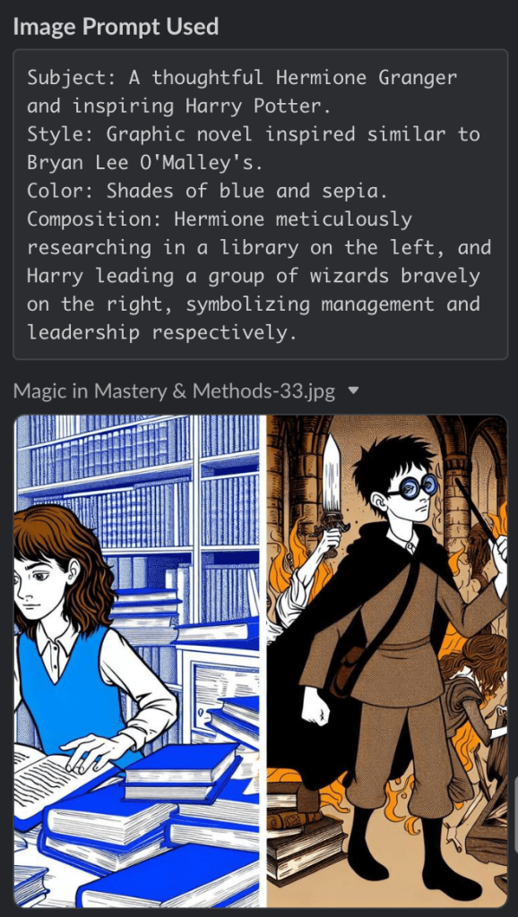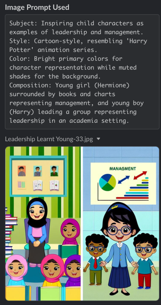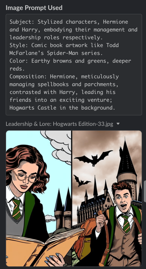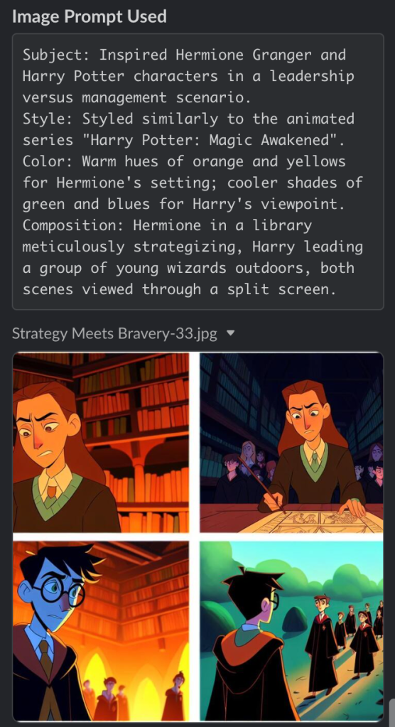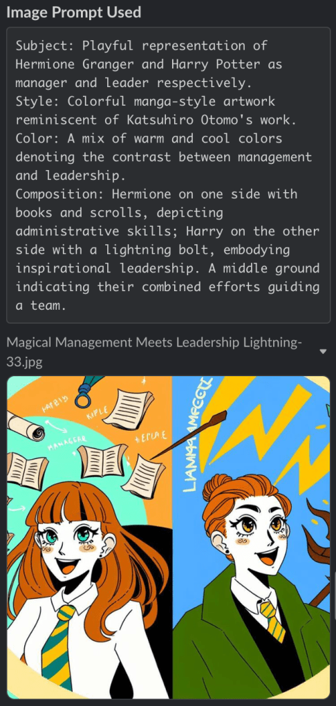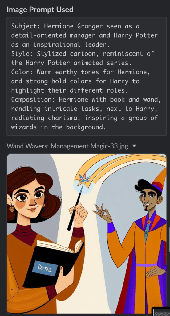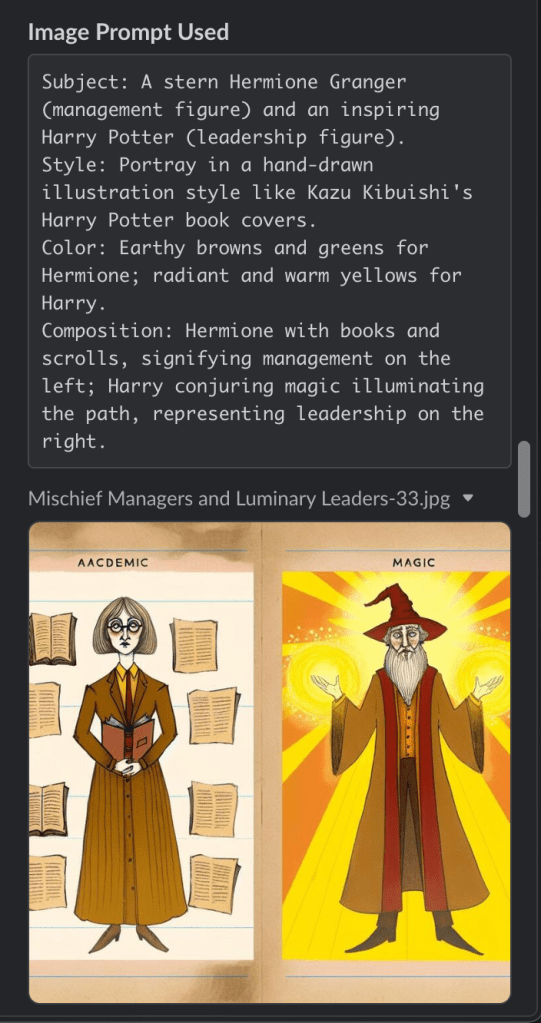 The following prompts and images are based on Sean Handley’s leadership vs. management article and shared on Slack. Each includes an approval or regeneration link.